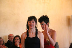 Grâce aux chaises, il peut devenir un lieu de pause, de contemplation, d’arrêt et de communication, nous faisant voyager d’un espace poétique à l’autre. La recherche de notre écriture scénique et textuelle se situe à l’endroit de ce que nous vivons avec les spectateurs, au présent de la représentation.